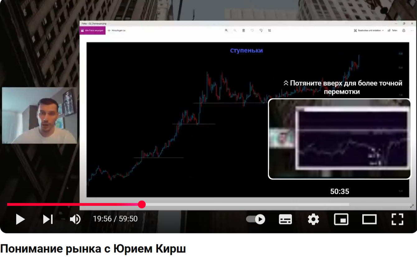 В интернете популярно видео Понимание рынка с Юрием Кирш в Ютубе. Здесь автор делится навыками торговли, разбирает разные элементы торговли на фондовом рынке и дает базовые навыки новичкам. Видео доступно на канале Сайгин Максим по ссылке youtube com/watch?v=UYFYDrQ4Fms и имеет всего 850 просмотров. Это говорит о низком интересе к работе автора.