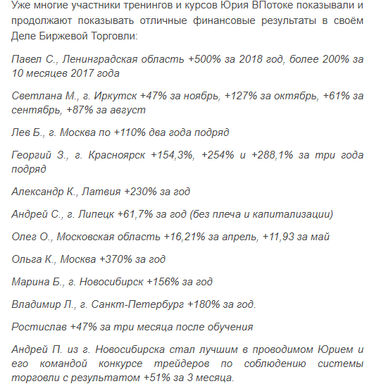 Однако, трейдер “Юрий В Потоке” публикует лишь имена. Связаться с этими людьми и уточнить информацию невозможно. А, значит, и доверия к ней немного.