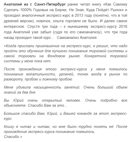 Основной сайт “Юрий В Потоке” отзывы трейдеров публикует в специальном разделе. Понятное дело, что только хвалебные.