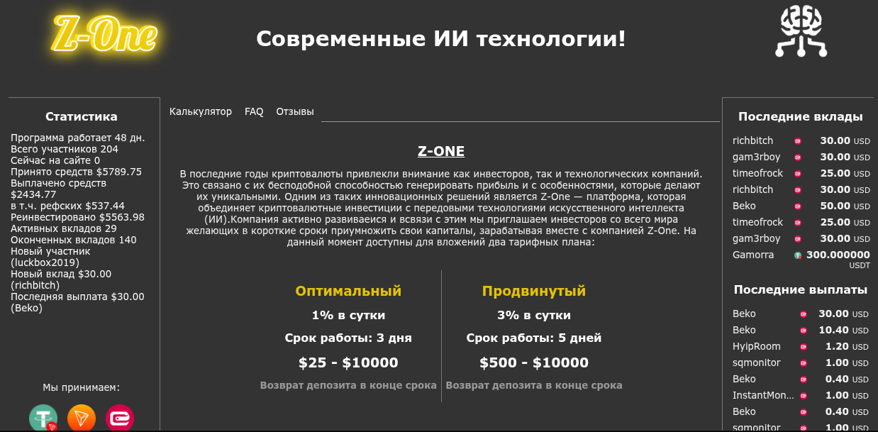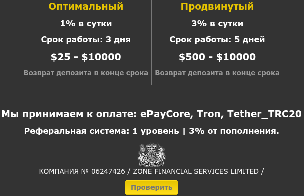 Возврат тела инвестиции Z One LTD в конце срока депозита. Для повышения лояльности есть одноуровневая реферальная система — 3% от пополнения. Внести деньги на счет можно через кредитные и дебетовые банковские карты по ePayCore, в криптовалюте TRON или стейблкоине USDT на блокчейне TRC20.