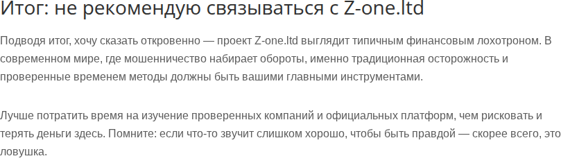 Далее в разборе Z One LTD раскроем такие аспекты как реальная эффективность ZONE FINANCIAL SERVICES LIMITED, стоит ли использовать услуги.