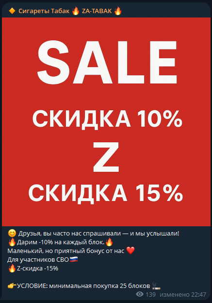 Стандартный пост канала Za Tabak описывает преимущества работы с проектом. Клиент может заказать не меньше 25 блоков за раз, участникам СВО делают скидку. Доставка возможна по всей территории России, от покупателя потребуется предоплата.