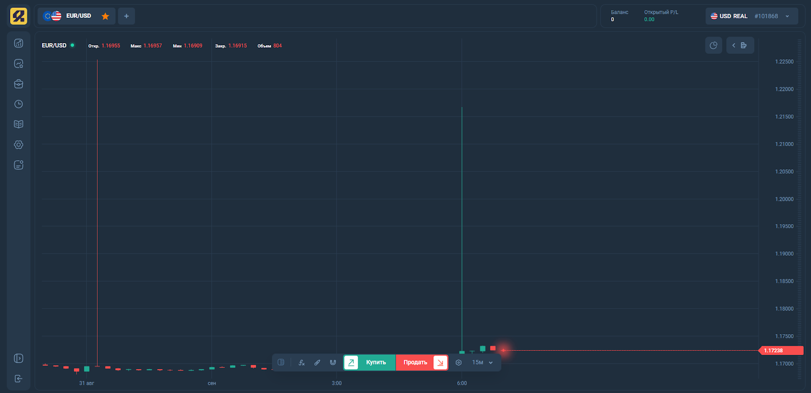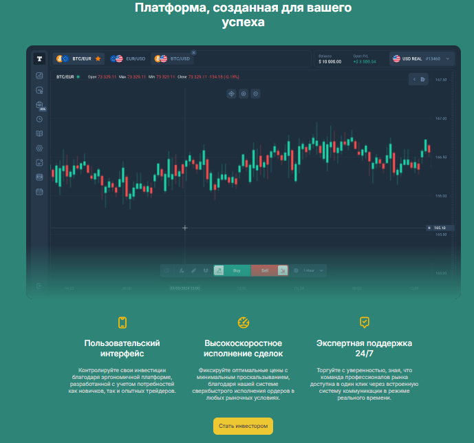 Посередине размещен график курсов, в левой части навигационное меню, а сверху кнопка для доступа в личный кабинет. Для завершения регистрации может потребоваться подтверждение номера, адреса и личности.