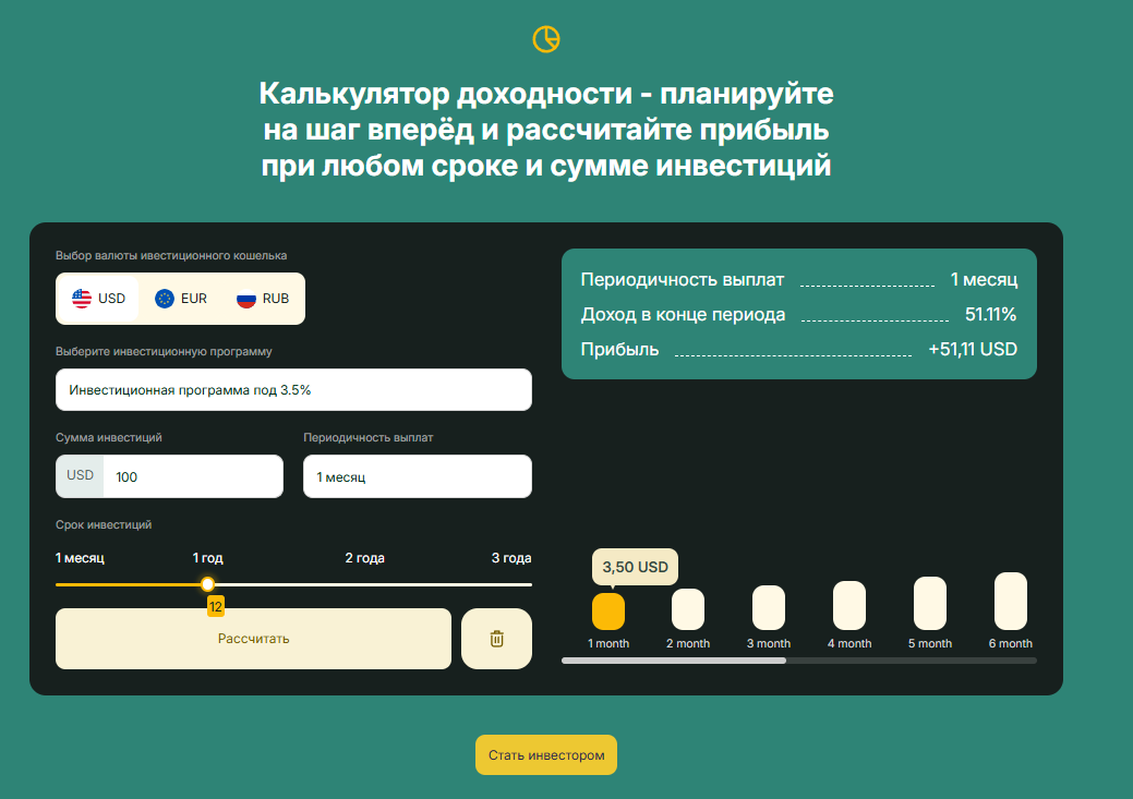 Эти условия не соответствуют реальным, если сравнивать с рынком. За месяц инвестиции принесут доход от 50%.