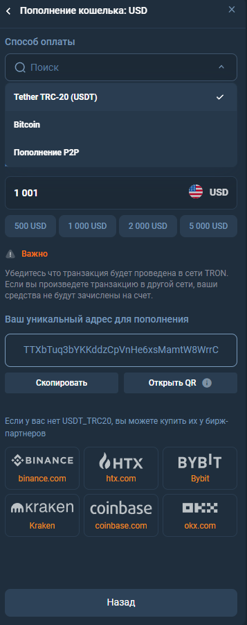 Пополнить баланс кошелька можно в криптовалюте и P2P переводом. Второй способ в реальности не работает.
