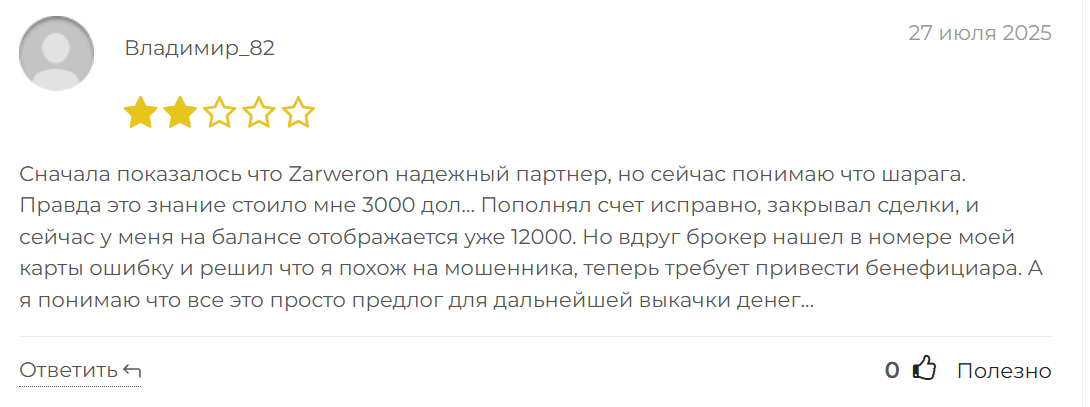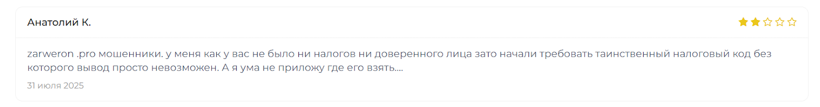 В сети есть отзывы о Zar weron cc, но все они встречаются лишь за 2025 год. Поэтому можно утверждать, что дата начала работы с 2017 года является обманом. О брокере «Зарверон» отзывы встречаются только негативные. Люди указывают, что сталкиваются со стандартными проблемами с выводом средств. После оформления заявки начинаются требования дополнительных документов, проводятся проверки и прочие действия, не позволяющие получить деньги. Через время аккаунт пользователя блокируется за «подозрительную деятельность».