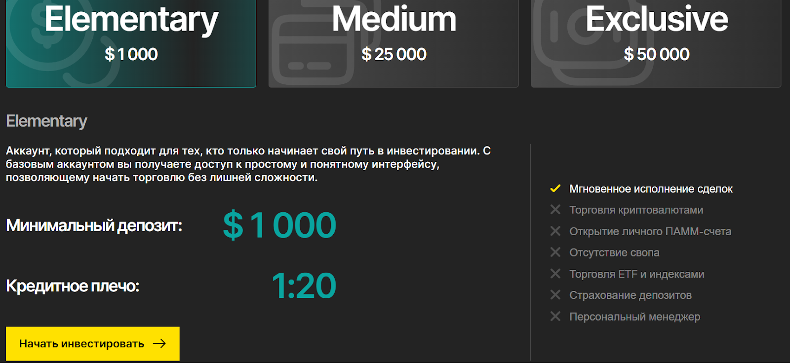 - elementary – депозит 1 тысяча долларов, кредитное плечо 1:20;