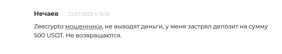 Отзывов на Zeecrypto Com в интернете не так много. Но практически во всех встречающихся упоминаниях сообщают о мошенничестве. Например, человек пишет о том, что не может получить обратно внесенные 500 USDT. Также можно найти обзоры, где проект обвиняется в скаме, а его жертвам предлагают юридическую помощь.