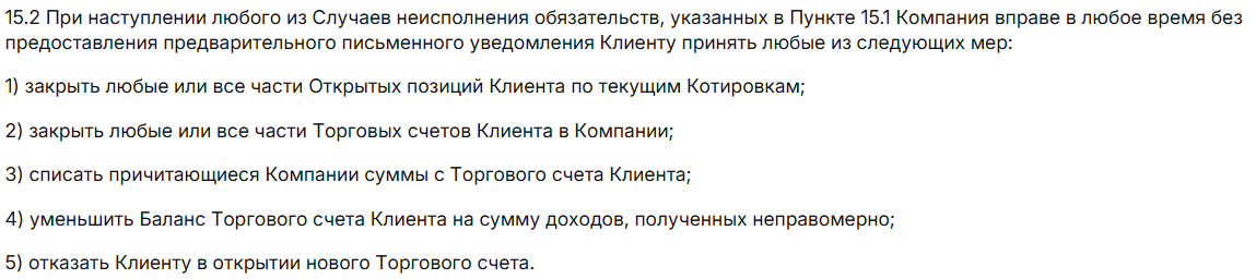 - соглашение разрешает блокировать счет и уменьшать баланс без предупреждения, поэтому потерять депозит можно вне зависимости от результатов сделок;