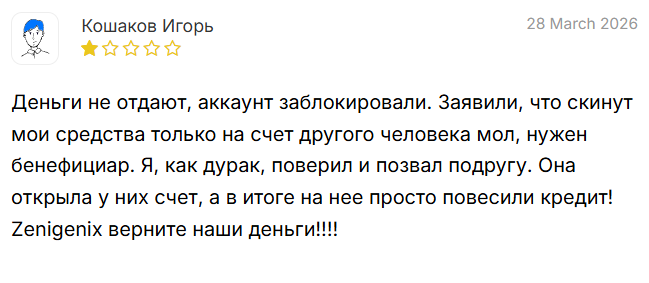 В сети только негативные отзывы о Zenigenix com. После внесения депозита клиенту заблокировали аккаунт и отказали в выводе денег. Затем компания предложила указать бенефициара для перевода средств на другой счет. Когда клиент привлек знакомую, та открыла аккаунт – и в итоге на нее оформили кредит. Это прямая иллюстрация обмана, при котором деньги теряет не только первый клиент, но и привлеченный им человек.