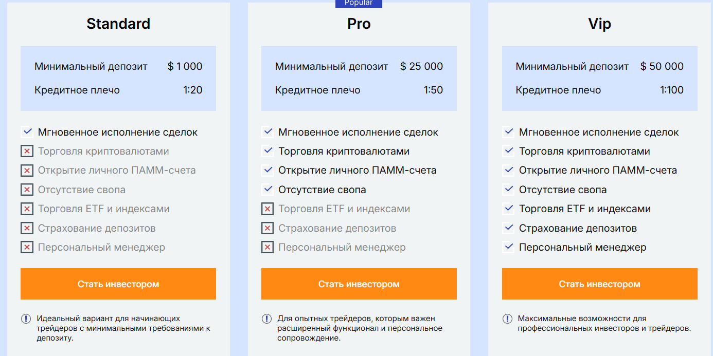 - Pro – от $25,000, плечо 1:50, доступна торговля криптовалютами и открытие ПАММ-счета;
