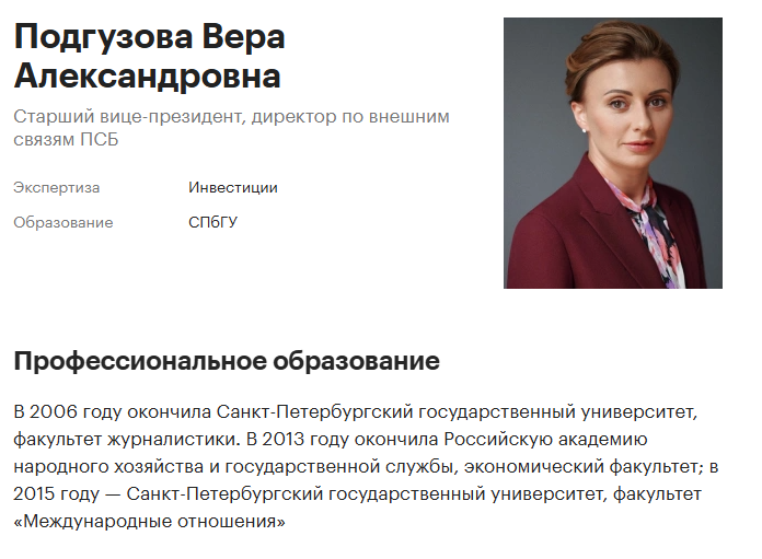 «Женское Лидерство в Инвестициях» – проект от ПАО «Промсвязьбанк». Платформа предлагает бесплатные курсы по инвестициям. Проект курирует старший вице президент ПСБ Вера Подгузова. РБК называет ее экспертом в инвестициях. Образование получила в СПбГУ. Регулярно комментирует финансовые новости крупным изданиям.