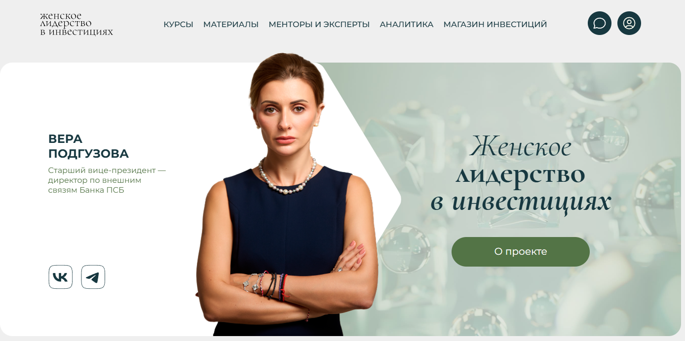 Проект «Женское Лидерство в Инвестициях» – необычная образовательная платформа от крупного банка. Куратор Вера Подгузова считается признанным экспертом. Бесплатный формат привлекает аудиторию.