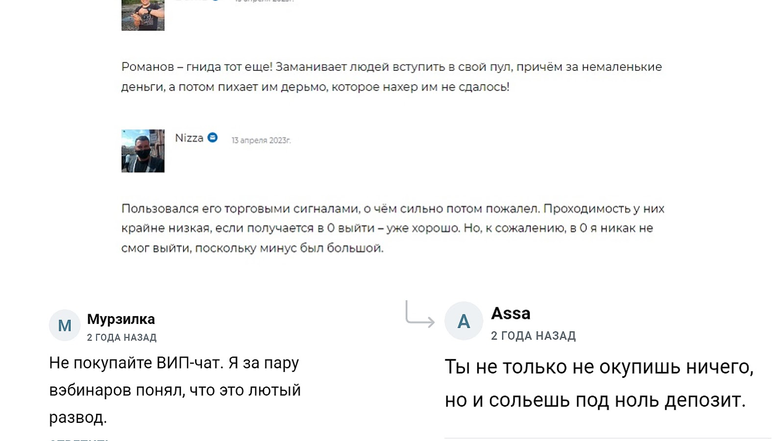 В сети о Евгении Романове отзывы крайне негативные. Пользователи не рекомендуют сотрудничать с этим трейдером и утверждают, что по его советам они потеряли деньги. Они утверждают, что проходимость у его сигналов низкая. Также есть жалобы, что автор заманивает новичков в пул, обещая прибыль, но в результате они теряют свои сбережения. Они рекомендуют обходить этот канал стороной.