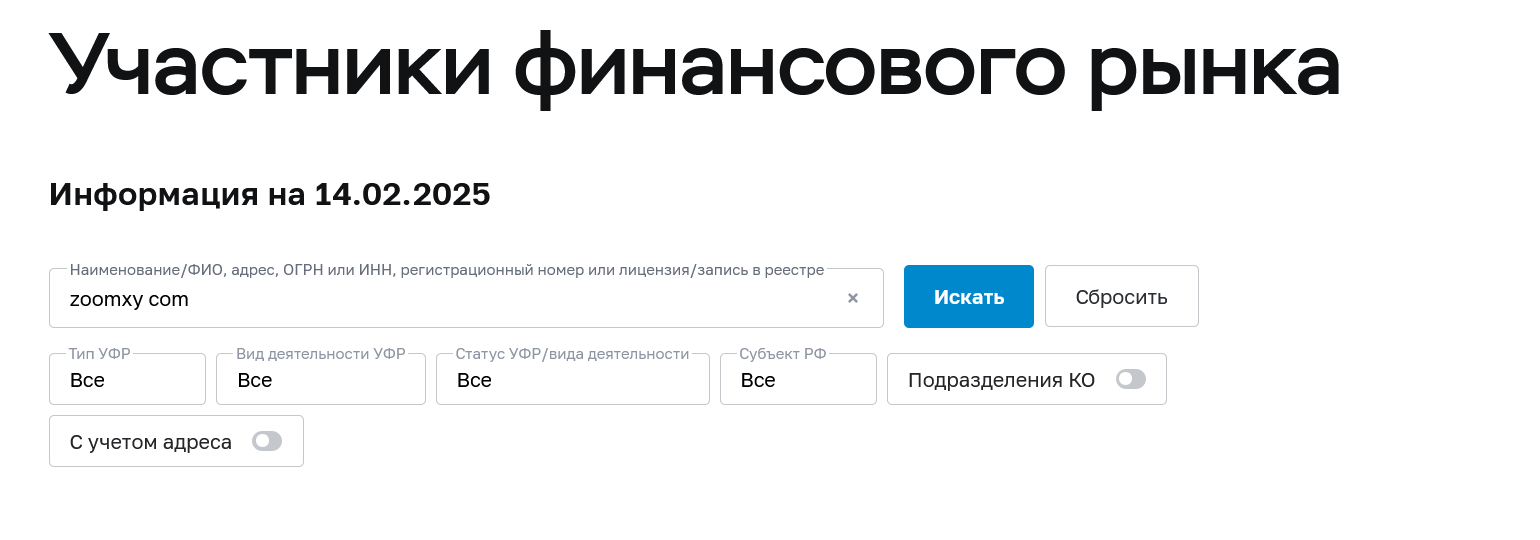 На сайте ZooMxy отсутствовали данные о международных регуляторах, проверка выявила отсутствие лицензии ЦБ РФ у обменника.