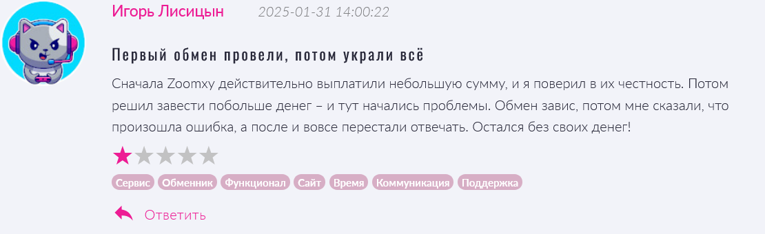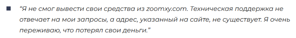 На сайте обменника не было оценок клиентов, на профильных сайтах можно встретить только негативные отзывы о ZooMxy com. Люди писали о том, что вывести деньги из проекта было невозможно. Контактов службы техподдержки, которые были указаны на сайте, не существует.