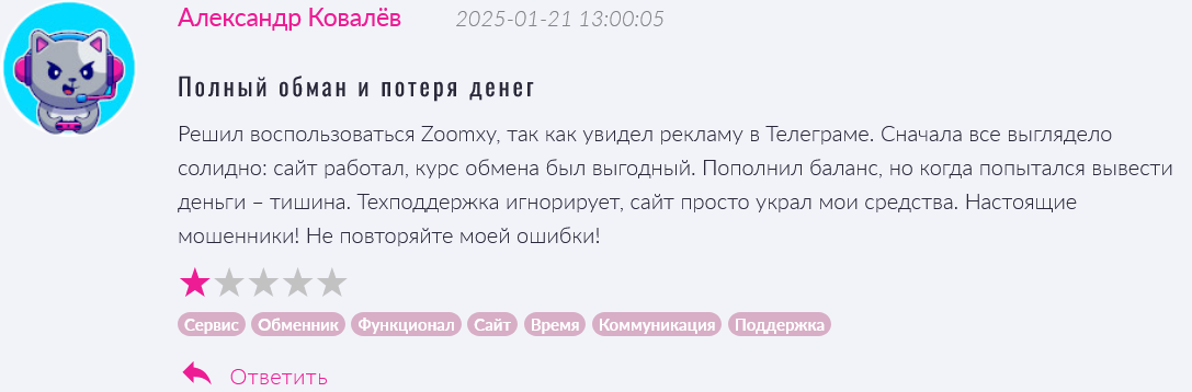 Клиенты регистрировались на сайте, увидев рекламу в Телеграмм. Сайт работал, обмен небольших сумм был выгодный. Крупную сумму заблокировали, поддержка клиентов в Телеграмм под ником zoomxy support не отвечала.