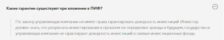 Все услуги рассчитаны на длительные инвестиции, минимальный период — год, но для большинства продуктов это три года. При досрочном выводе средств клиент теряет около 3%. Никакие промежуточные выплаты заработанных процентов (как в банках) не предусмотрены, пай можно продать (обменять) только в полном объеме. На сайте есть калькулятор доходности, где можно рассчитать предполагаемую прибыль, но это не означает, что конечный результат будет таким же, поскольку расчеты запрограммированы на показателях предыдущих периодов. В правилах и описании работы четко указано, что компания не дает никаких гарантий повторения успешных результатов и получения анонсированной прибыли.