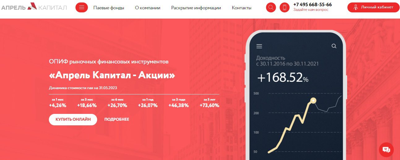 Вся работа ведется через официальный сайт https://april-capital.ru/, который был запущен в 2017 году. Интернет-ресурс выдержан в строгом корпоративном стиле, в формате одностраничника, где представлена основная информация о компании и услугах. Для более подробного ознакомления с деятельностью УК Апрель Капитал, на сайте есть все документы с регламентами, правилами, аналитикой, статистикой и другой информацией, все они открываются в отдельных вкладках и доступны для чтения.