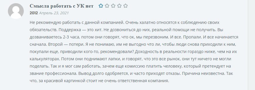Реальные инвесторы утверждают совсем обратное — доходы не соответствуют обещаниям, а с вычетом процентов за обслуживание они даже ниже банковских. Условия инвестирования намного жестче чем в банках, вывод депозита возможен только через год-три. Клиенты не рекомендуют доверять свои финансы компании Апрель Капитал, она не внушает доверия.