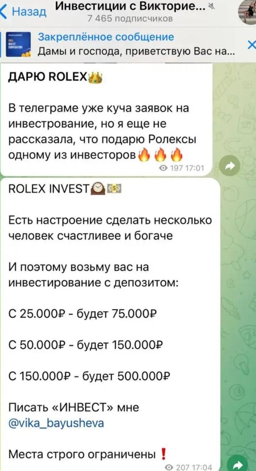 Основателем телеграм-канала об инвестициях является некая Виктория @ vika bayushe. О себе она ничего не рассказывает, но зато готова всем желающим помочь заработать, используя систему раскрутки депозита. А так как неизвестно, насколько она опытная в этой сфере, есть большой риск мошенничества.