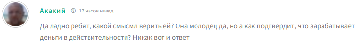 Есть люди, которые скептически относятся к ее пути в сфере финансов. Им не нравится, что инвестор не выкладывает статистику своих активов, поэтому пользователи не видят смысла доверять ей своё время.