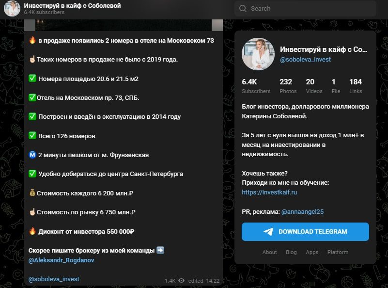 Катерина Соболева публикует информацию о покупке недвижимости. В таких публикациях она раскрывает стоимость апартаментов, их площадь и другие качества, в том числе указывает, сколько вероятнее всего получится заработать на таком приобретении.