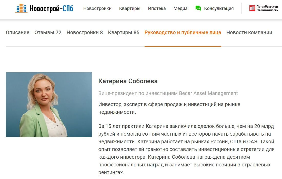 Катерина Соболева — инвестор с большим опытом торговли на рынке доходной недвижимости. Несмотря на престижную должность, необходимо обратить внимание на следующее: