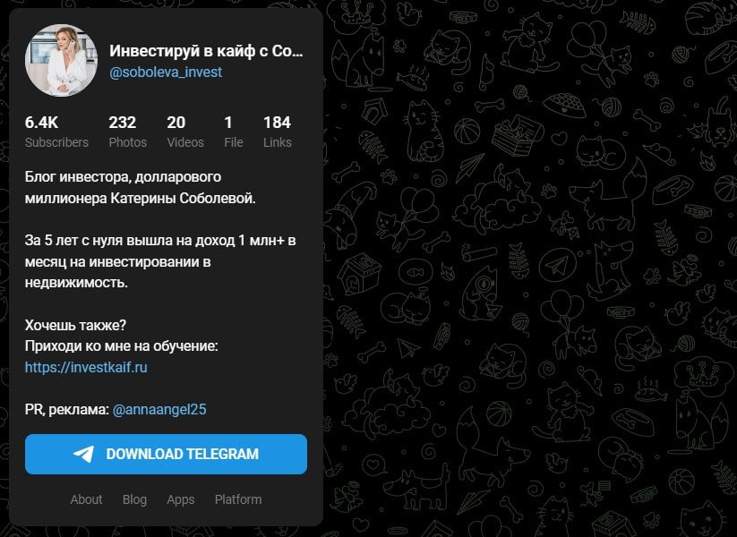 Катерина Соболева — инвестор, известная как вице-президент компании Becar Asset Management Group. Она создала Телеграм-канал “Инвестируй в кайф с Соболевой”, в котором делится с подписчиками своим опытом инвестиций на рынке недвижимости.