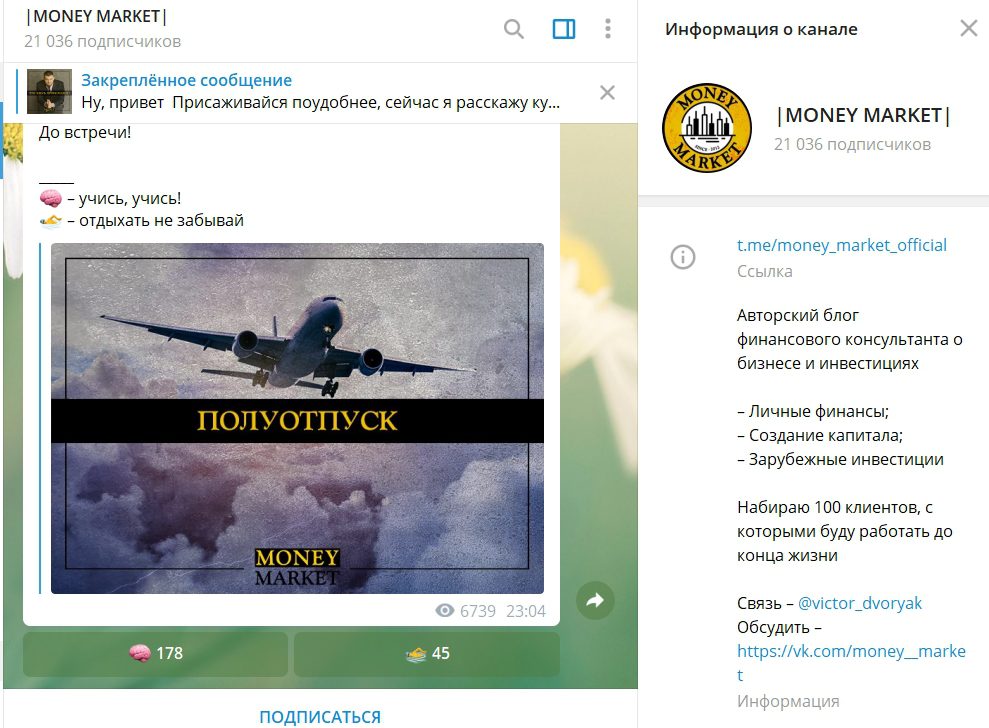 Money Market — проект в Телеграме с более чем 20-тысячной аудиторий. Это авторский канал Виктора Дворяка, который позиционирует себя, как финансового консультанта и предпринимателя. Он делится своим накопленным опытом и помогает понять новичкам тему инвестиций. Можно ли доверять этому человеку, расскажем далее.