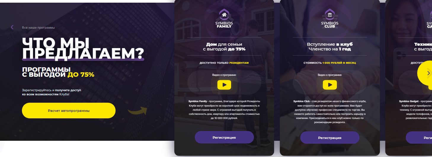 Судя по отзывам в сети, компания Symbios Club предоставляет следующие варианты сотрудничества: