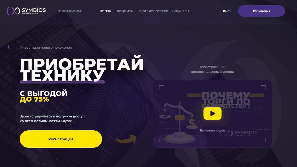 Симбиоз Клуб — это инвестиционный проект, предлагающий клиентам приобретать за полцены различные объекты, подлежащие распродаже на торгах после банкротства их владельцев. Мы внимательно изучили деятельность компании а и проанализировали список услуг, которые она предоставляет. О том, стоит ли сотрудничать с проектом, читайте в нашем обзоре.