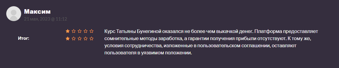 Судя по реальным отзывам об обучении у инвестора Татьяны Бунегиной, вернуть деньги пользователи не могут. Все запросы и требования остаются без ответов. Девушка уверяет, что стабильно имеет от 28% доходности в год. Но никаких доказательств этому нет. Публичный счет и верифицированные данные отсутствуют. Татьяна Бунегина – обычная инфо-цыганка. Тратить время на обучение у нее не стоит. Пользователи не получать ценные знания.