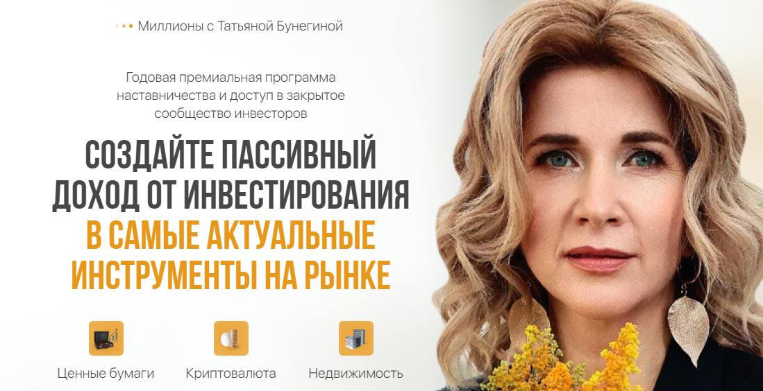 Еще один продукт — программа «Миллионы с Татьяной Бунегиной». Это годовой курс, который включает доступ в закрытое сообщество инвесторов. В рамках программы участники получают возможность освоить работу с ценными бумагами, токенами. А также понять, как вкладываться в недвижимость. Программа предполагает следующие мероприятия: