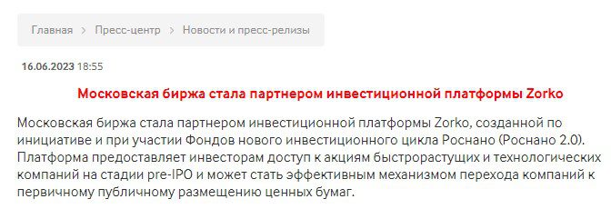 За созданием Zorko-Exchange стоит известная в России Роснано. Она будет подбирать перспективные проекты, а Зорко займется привлечением в них денег частных инвесторов. Итогом должен стать «бесшовный» переход компаний со стадии pre-IPO к торгам на фондовой бирже.