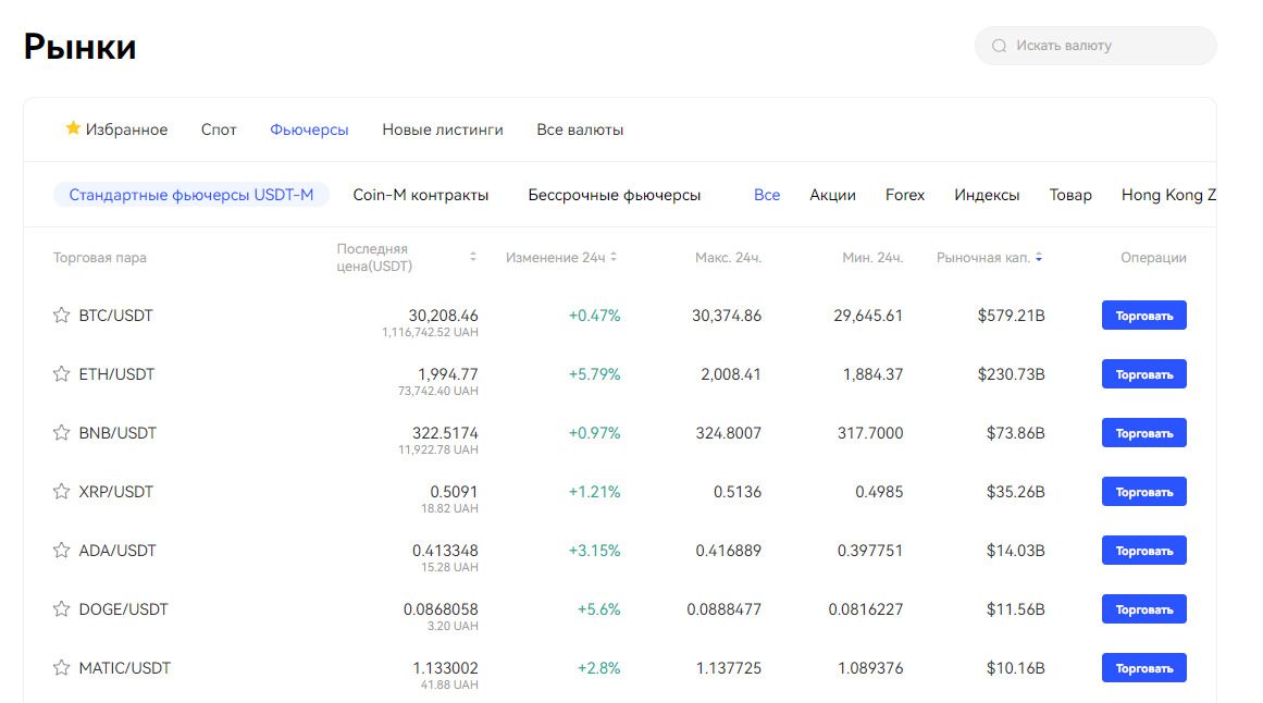 1. Спот. Доступна торговля с помощью лимитного и рыночного ордера, а также приказа с дополнительными условиями. Есть возможность оформления триггерной заявки, при которой участник заранее указывает условия для купли-продажи.