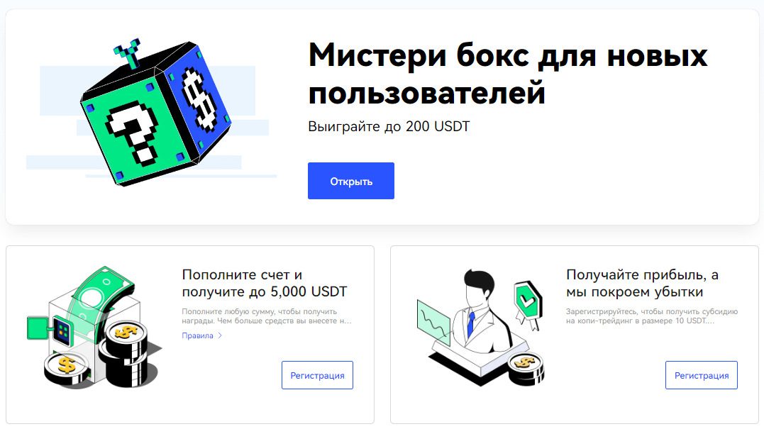 Не менее интересным выглядит приветственный подарок при регистрации и покрытие части убытков при копи-трейдинге. Дополнительно можно получить подарки за активную торговлю. К примеру, за общий депозит от 200 USDT выдается 2 USDT в подарок. Если наторговать на спот-рынке больше 300 USDT, доступно 3 USDT и т. д.