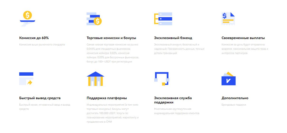 3. Партнерская программа. Участие в проекте позволяет получать до 60% комиссии, что выше других предложений на рынке. Также открывается доступ к бонусам, эксклюзивным подаркам и другим возможностям.