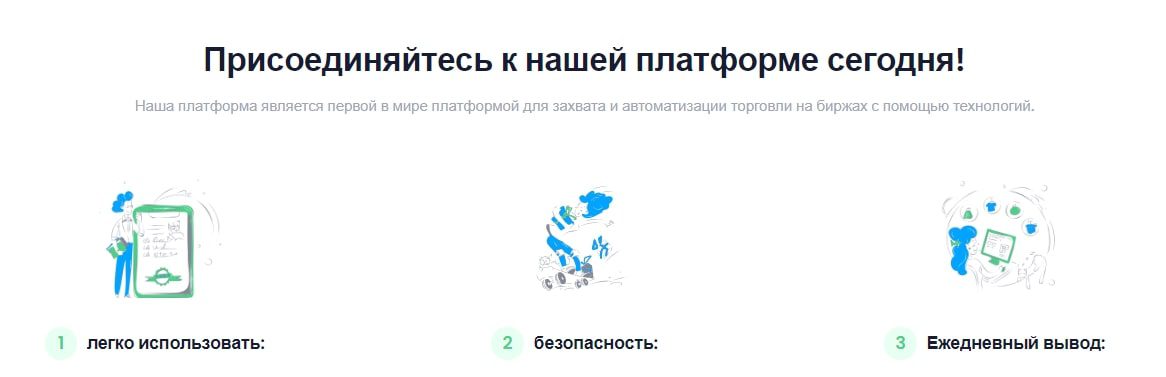 Работа ведется с помощью торгового бота, предназначенного для автоматизации процесса торговли криптовалютами и другими финансовыми активами. Он использует эффективный алгоритм, который, как утверждают разработчики решения, опережает рынок на 0.01 секунды с точностью 85%. Предназначен для работы круглосуточно, позволяя избежать ручного анализа больших объемов данных. Пользователи могут выбирать между автоматической и ручной торговлей.