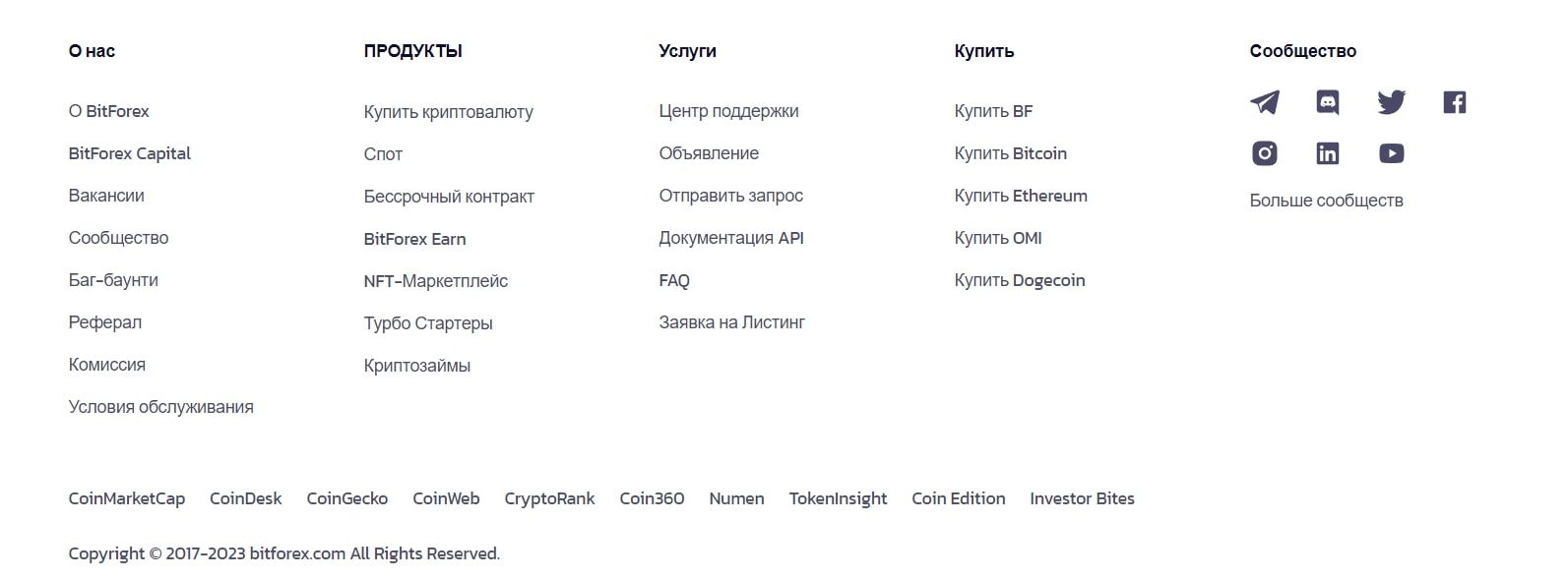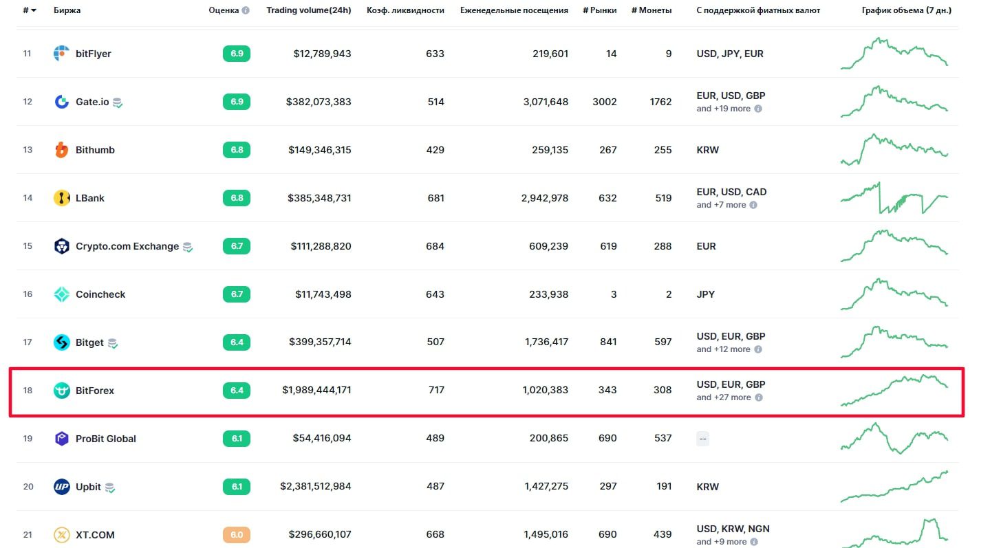 Bitforex — биржа, на торговой платформе которой есть большой выбор услуг от торговли криптовалютными активами до заработка на листингах монет. Также трейдеры могут воспользоваться кредитами от компании, работать с NFT, получать стабильные проценты в стейкинге. Битфорекс работает более 5 лет, имеет неплохую капитализацию, входит в топ 20 бирж по торговым объемам. Среди отзывов можно найти как положительные, так и отрицательные комментарии.