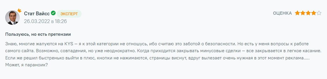 У биржи есть веб браузерная версия и мобильное приложение. Пользователи отмечают, что биржу ни разу не взламывали, то есть клиентские деньги надежно защищены. На платформе большое количество регулярных трейдеров, но есть претензии, в которых компанию обвиняют в умышленной задержке исполнения ордеров. По заявленной информации контора обрабатывает 1,6 млн заявок в минуту, однако в моменты фиксации прибыльных позиций ордера могут зависать, что сокращает полученный доход. Верификация данных при небольших объемах депозита не обязательна. Однако прохождение KYC может дать трейдеру ряд преимуществ, в том числе снижает комиссии. Пополнение возможно только криптовалютами, с банковскими картами платформа не работает.