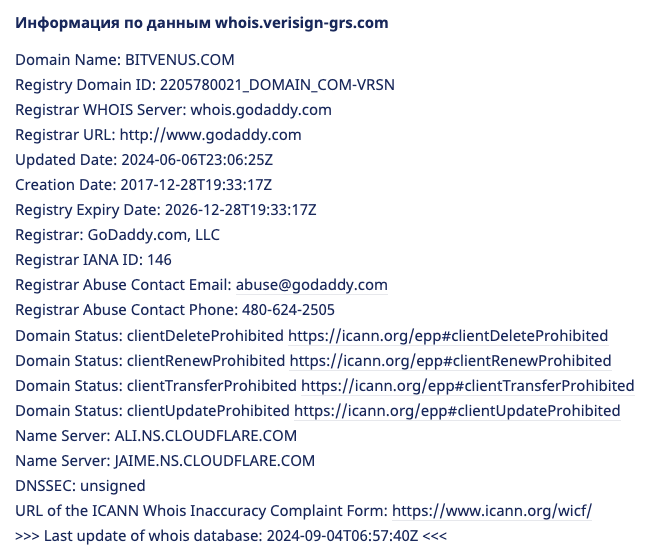 Доменное имя bitvenus com, согласно сведениям Whois, было выдано регистратором еще в 2017-м году. Однако есть одна странность.
