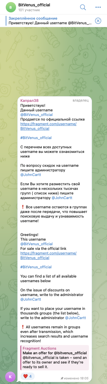 В телеграмм-чате BitVenus official, на 4 сентября 2024-го года, состоит всего 101 участник. При этом, в нем присутствует только одно сообщение – о продаже соответствующего имени.