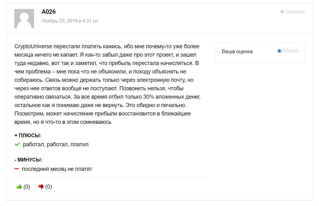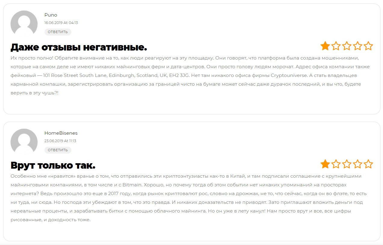 На сторонних ресурсах можно обнаружить большое количество негативных отзывов о CryptoUniverse Cloud Mining. Они свидетельствуют о том, что эта и подобные конторы – лохотроны. Вот примеры некоторых комментариев.