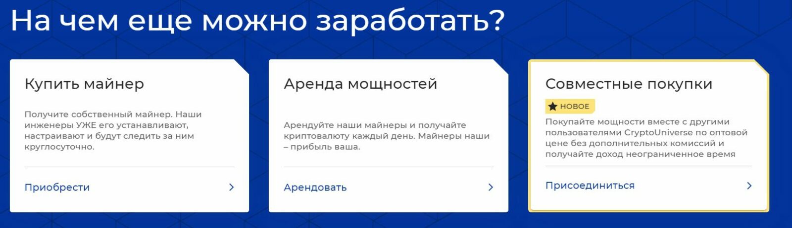 CryptoUniverse – торговая площадка для облачного майнинга. На ней предлагается купить криптовалюту и в дальнейшем получать хороший ежемесячный доход. Мы изучили деятельность платформы. О том, стоит ли там работать, вы узнаете в нашем обзоре.