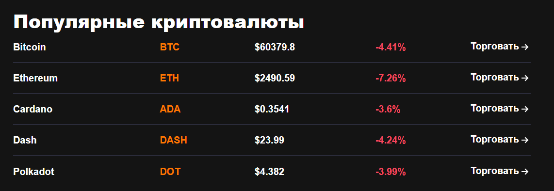 Пользователям Fenixo Dex предлагается ввести свой E-mail, чтобы начать торговлю криптовалютами. После регистрации можно получить доступ к популярным криптовалютам. Поддерживаются Bitcoin, Ethereum, Cardano, Dash, и Polkadot. Однако полный список доступных криптовалютных пар можно увидеть только после регистрации и получения клиентского статуса. Есть также малоизвестные токены, скам-монетки не предлагаются.