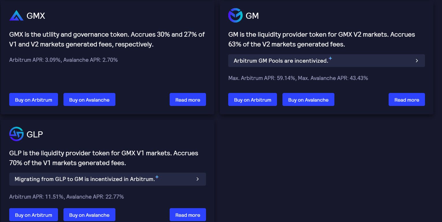 GLP — это токен, представляющий собой индекс всех токенов, присутствующих в определенной сети. К примеру, в Arbitrum токен GLP является средневзвешенным между 8 активами: UNI, USDC, TETHER, ETH, BTC, LINK, DAI и FRAX. Покупая токен GLP, пользователи предоставляют ликвидность для проведения операций с низкими комиссиями и получают за это награду. В настоящее время на Arbitrum пользователям выплачивается 27.7% годовых в виде награды за хранение монеты GLP. Выплата производится в ETH из доходов платформы. Награда GMX в сети Avalanche чуть меньше и в настоящее время равна 22.36%, выплата производится в родном для этой сети AVAX.