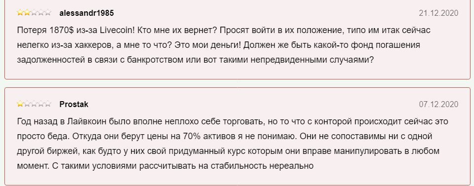 Отзывы о Livecoin на сторонних источниках утверждают, что компания всячески затягивала процесс вывода средств, а обещанные вложения так и не вернули. Владельцы сайта исчезли из интернета, а о сайте компании и по сей день ничего не известно.