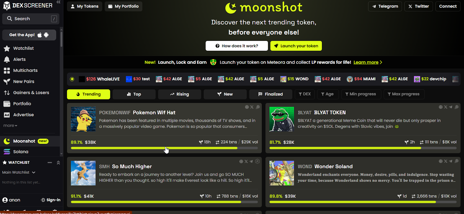 Специальный алгоритм moonshotdotcc позволяет отслеживать данные по тысячам монетам в криптовалютном пространстве. Здесь же можно производить непосредственные действия по торговле – например, обменивать активы. Администрация moonshot cc уверяет в отсутствии дополнительных или скрытых комиссий при подключении собственного кошелька.