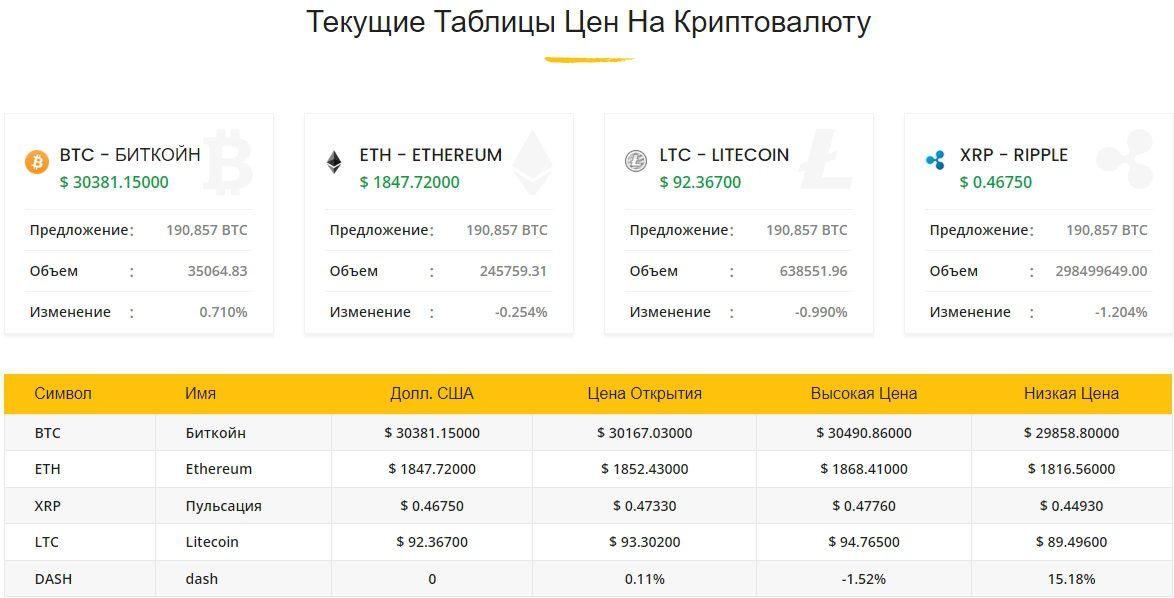 Таблицы цен на коиптовалюту